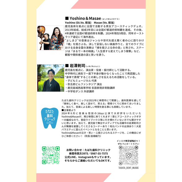 2024年8月に音楽&怪談の2days公演で大好評をいただいたYoshino&Masaeが、再び串間に来てくれます!歌とアコースティックギターの編成なので、普段ライブハウス等に行き慣れていない方でも聞きやすいと思います。加えて、鹿児島で舞台やメディアでも活躍中の岩澤剣司さんが舞踊を披露してくださるコーナーあり!地元バンドの出演あり!大変バラエティに富んだイベントとなることと思います。Yoshino&Masaeの泣き・笑い・心揺さぶられるステージを、この機会にぜひご体感ください!