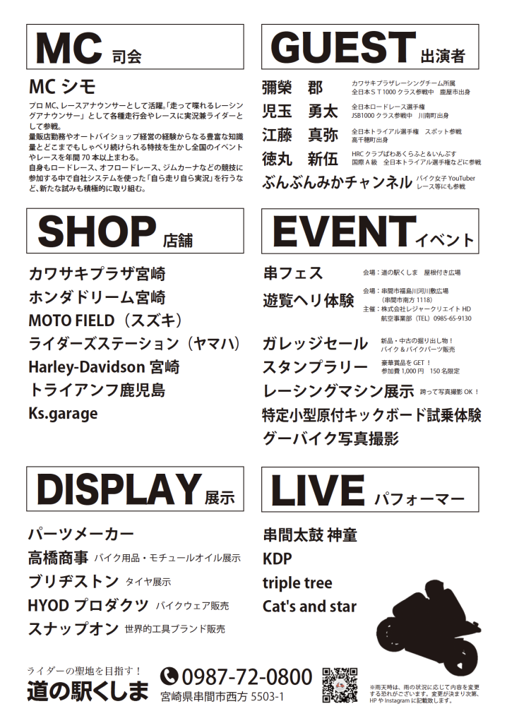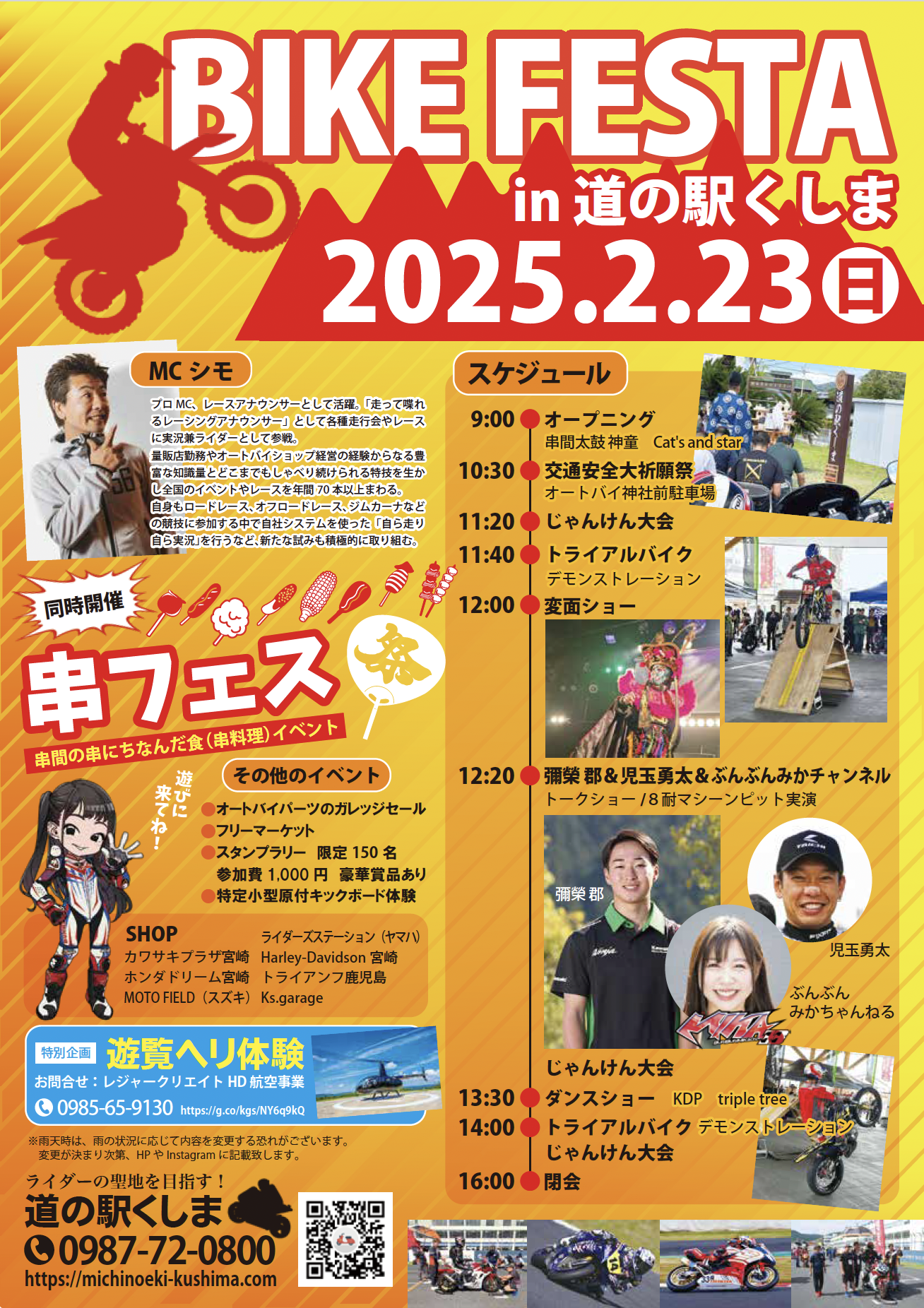 BIKE FESTA in 道の駅くしま 2025 1/28 串間市イベント 2025-01-28 目次日時 2025年2月23日(日) 会場 道の駅くしま 串間市イベント この記事が気に入ったら いいね または フォローしてね! Follow @kushimedeia_mz Follow Me よかったらシェアしてね! URLをコピーしました! URLをコピーしました! 第13回串間市「地域安全」・「交通安全」市民大会 ワタナベお笑いライブin 串間 関連記事 第59回串間市民秋まつり 2025-10-31 [灯台記念日] 都井岬灯台特別公開 2025-10-31 第2回カラオケ18番オハコ 2025-10-31 宮崎観光ホテル串間フェア 2025-10-09 串間市民音楽祭2025 2025-10-09 串間市長選挙 開票速報 2025-09-26 レスリングフェスティバル~湯元健一監督がやって来る 2025-09-26 第42回福島港花火大会 2025-09-26