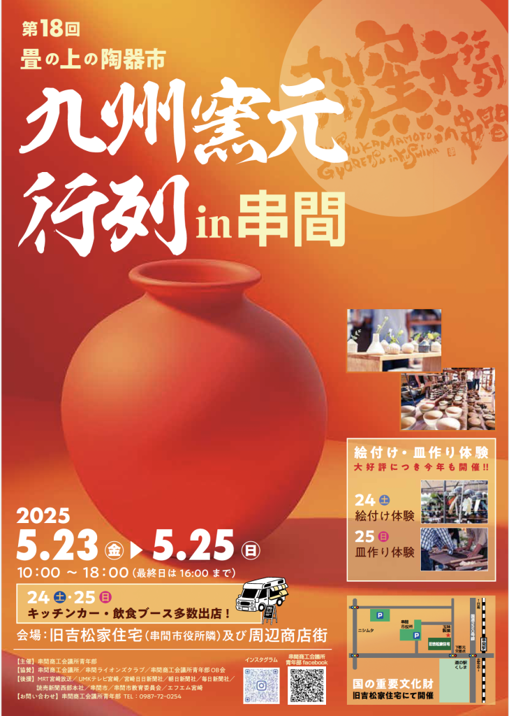 九州の若手陶芸家らの作品が並ぶ畳の上の陶器市「第18回九州窯元行列in串間」が5月23(金)~25日(日)の3日間、旧吉松家住宅および周辺商店街で行われます。また、絵付け、皿作り体験の体験会が実施され、同住宅前では地場産品の販売が行われるなど、見どころ盛りだくさん!ぜひ皆さんお越しください!