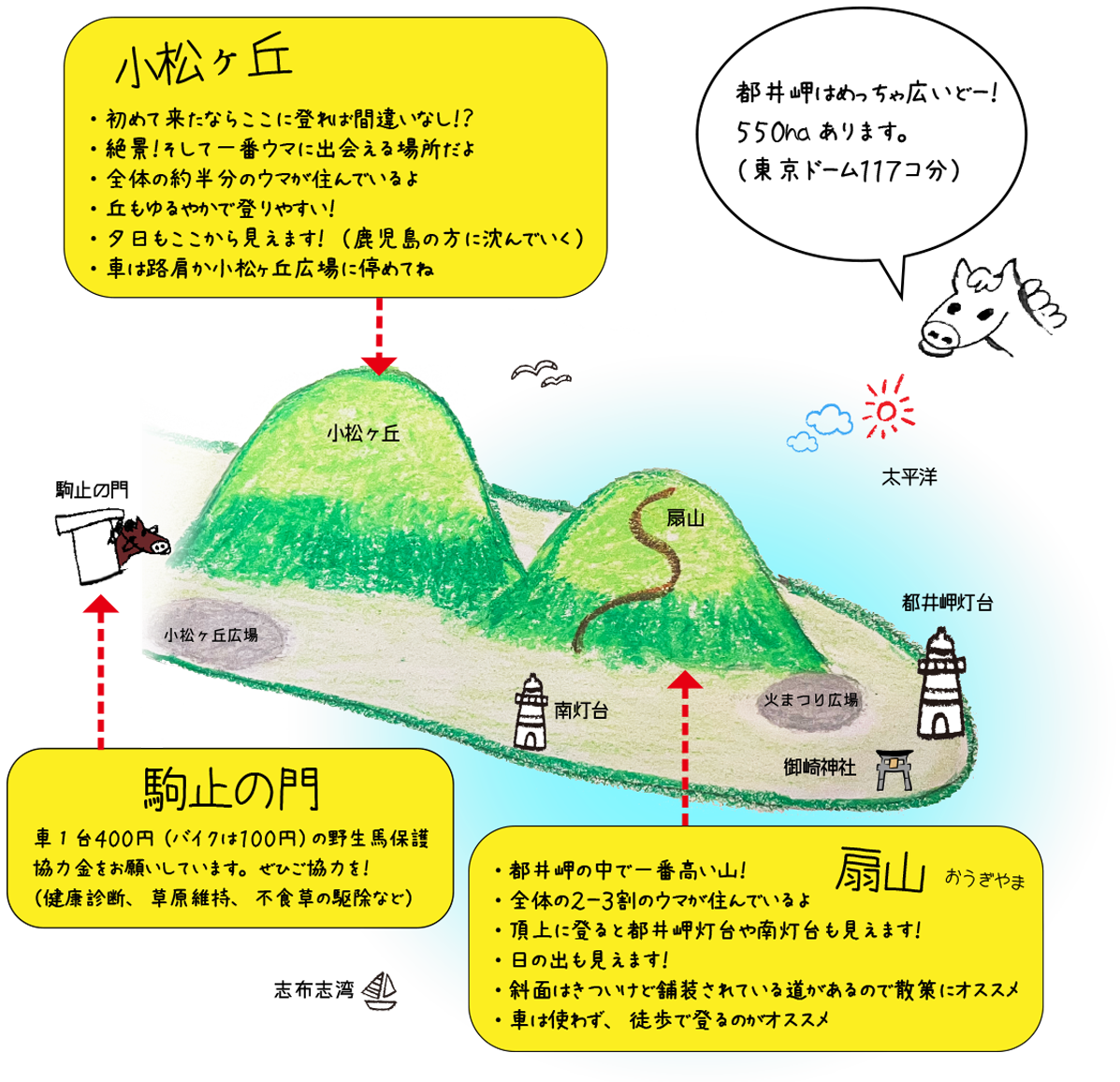 都井岬は国定公園であり、野生馬の保護区域です。野生馬をはじめ多くの野生動物が生息する場所です。生態系が崩れるため、ペットなどの動物の持ち込みは禁止いたします。